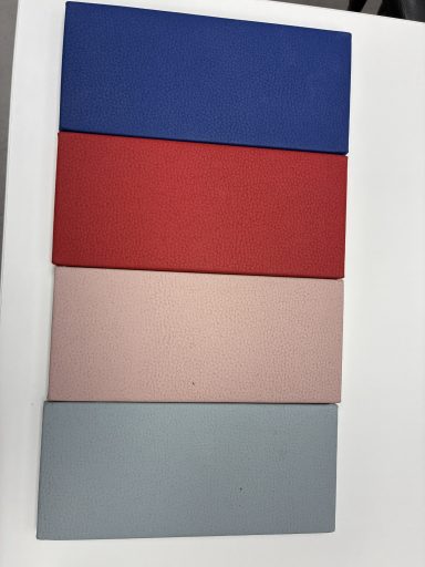 Basis für die geprägten Leder (es gibt verschiedene Prägungen) ist ein durcchgefärbtes Rind-Nappa-Leder. Wir haben Häute zum Anfassen in der Ausstellung.